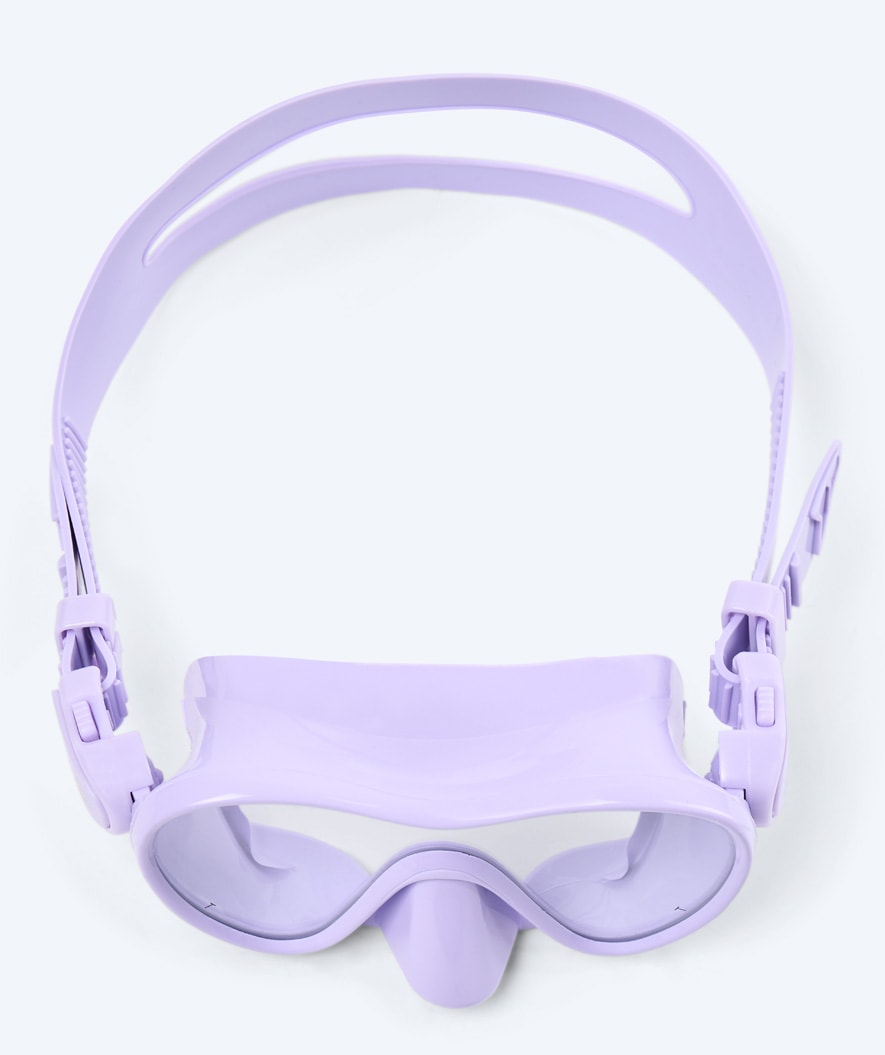 The Cliff diving mask for kids is equipped with one strap, which is then divided at the end, so that the mask will sit tight and correctly - even during longer snorkelling trips. On the straps, small knobs have been added, so that they will stay exactly where you put them to start with.