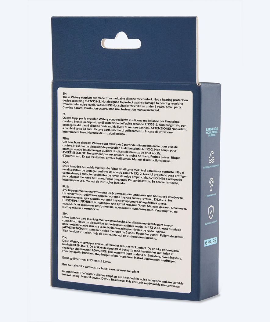 The earplugs can basically be reused until their surface no longer becomes sticky or if they become dirty. Depending on how well you take care of your Watery Indra earplugs for kids, they can be reused up to 12 times before it is recommended that you replace them. However, this is only a rule of thumb, as after a long time in chlorine or salt water, they can lose their stickiness, making it more difficult to get them stuck in the ear.