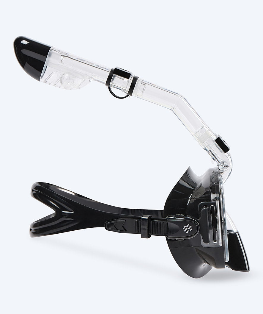 The full-face mask is the ideal combination of a diving mask and snorkel - combined in one product with the Pearl Full-face snorkel mask. What's special here is that the snorkel can still be removed and used as a regular diving mask. Made with a fog-free lens, a 180-degree view and a unique top-dry system that ensures that you don't get water in your mouth/mask underwater and that you don't inhale the same air you just exhaled