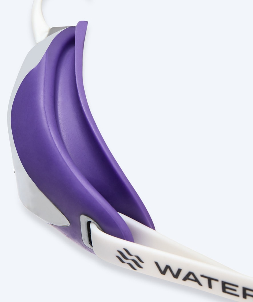 Designed to make you faster in the water with a hydrodynamic low-profile design, made with soft silicone eyecups for a comfortable fit, a wider 180-degree view from the curved lenses and a Mirror lens that shields sun and glare from your eyes. With this, Poseidon Mirror has instantly become one of our most popular swimming goggles for both competitive and recreational swimmers who value reduced water resistance, great comfort and a clear and wide view. Here in our purple colour with silver mirror