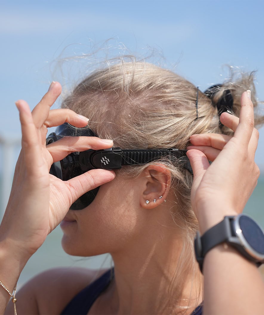 The unique strap construction, with a split at the end, ensures that the mask stays firm and correct, even through longer snorkeling trips. Small knobs on the straps keep them in place.