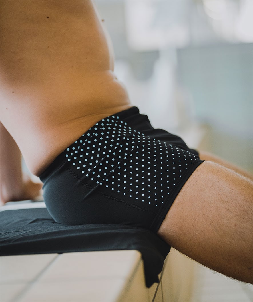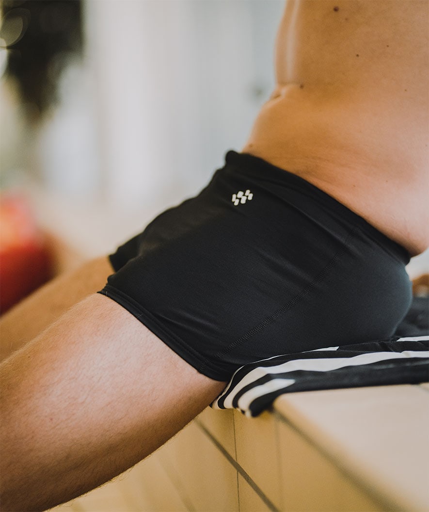 The design is kept simple and stylish with a discreet white logo in the top left corner and a side length that goes to the top of the thigh. After +150 tests on men of all sizes, we've hit the sweet spot on the length, where they're not too short and intimidating, but not so long that they feel like swim shorts. You're guaranteed to experience the instant gratification that this gives any man who has tried the opposite before.