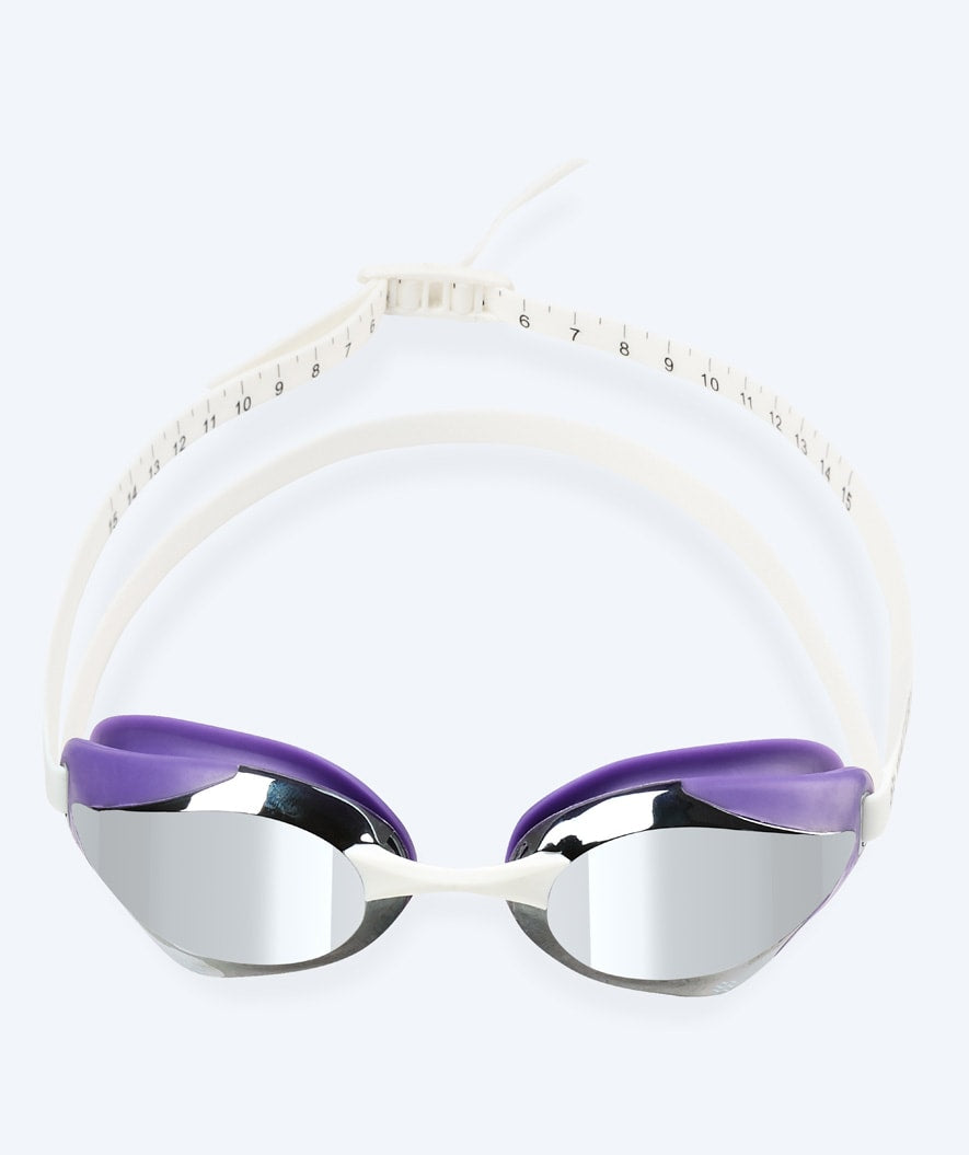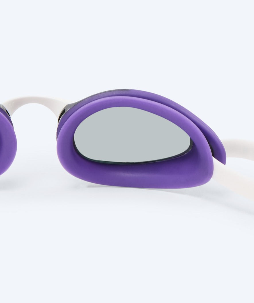 Designed to make you faster in the water with a hydrodynamic low-profile design, made with soft silicone eyecups for a comfortable fit, a wider 180-degree view from the curved lenses and a Mirror lens that shields sun and glare from your eyes. With this, Poseidon Mirror has instantly become one of our most popular swimming goggles for both competitive and recreational swimmers who value reduced water resistance, great comfort and a clear and wide view. Here in our purple colour with silver mirror