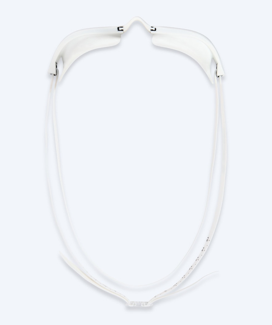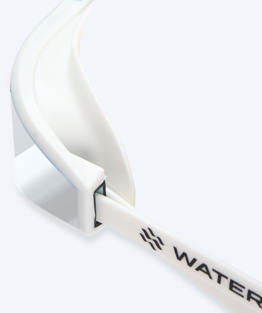 The Watery Storm Racer Mirror is designed specifically for competition and training swimmers who need the lowest possible water resistance, a low-profile fit and curved lenses for great visibility. Here in our white model with silver mirror