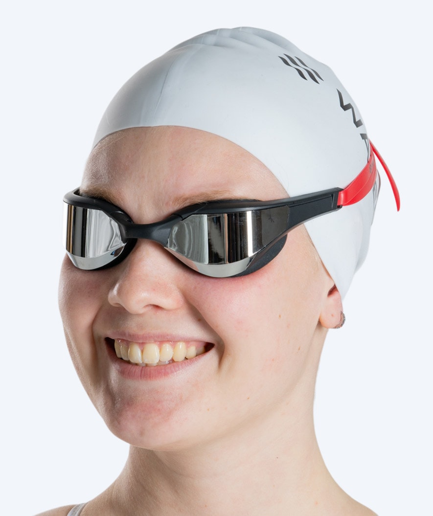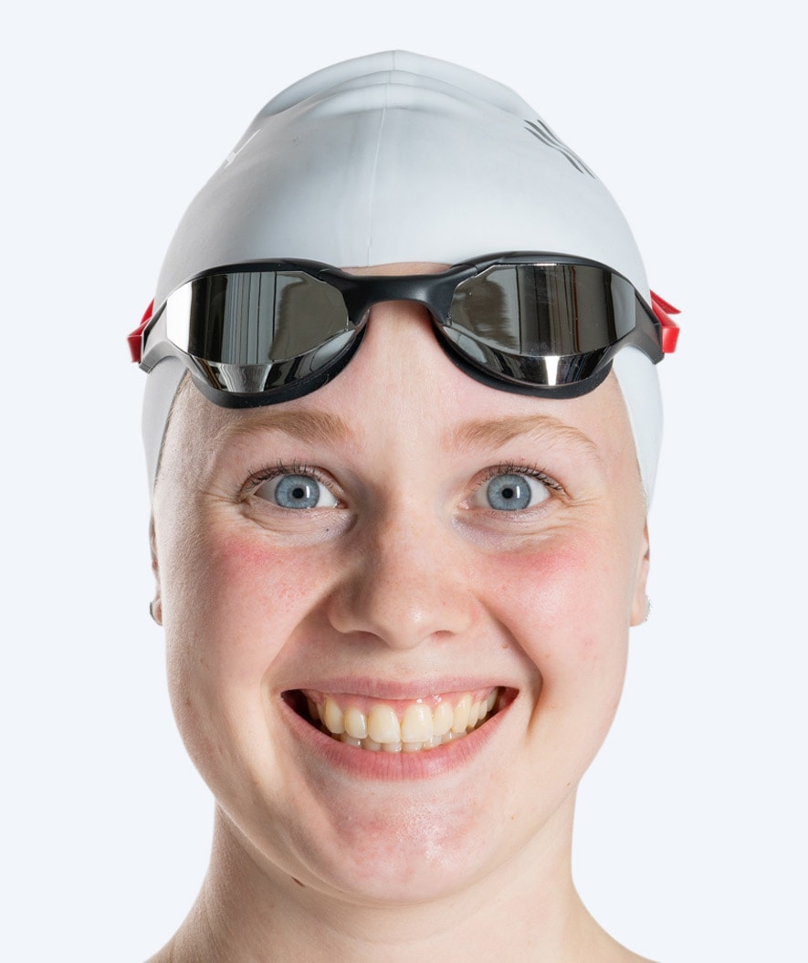 This Instinct Elite Mirror is red with a silver mirror, where it can be used both in the swimming pool and on the beach. Instinct Elite is available in the following colours: black, purple, white, pink, red, and blue. Instinct is available with gold mirror and frames in the colours white, pink and black, as well as with blue mirror with frames that are white and black.