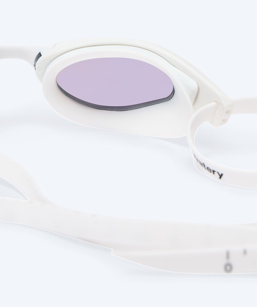 This Instinct Ultra Mirror is white with a gold mirror, making it suitable for both the pool and the beach. Instinct Ultra is available with silver mirror and frames in the colours: Black, white, pink, purple, blue, and red. Instinct is available with gold mirror and frames in the colours white, pink and black, and blue mirror with white and black frames.