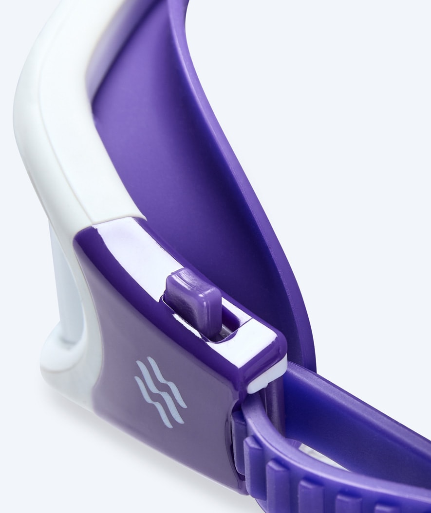 This is our most comfortable swim goggle with a unique 3D-made fit, which ensures that water is kept out of the goggle and does not make marks around the eyes - which is why the Raven Mirror has also quickly become our most popular goggle among both female and male exercisers. Swimmers, open water swimmers as well as regular bathers who value comfort and fit the most. Here in the purple and silver mirror
