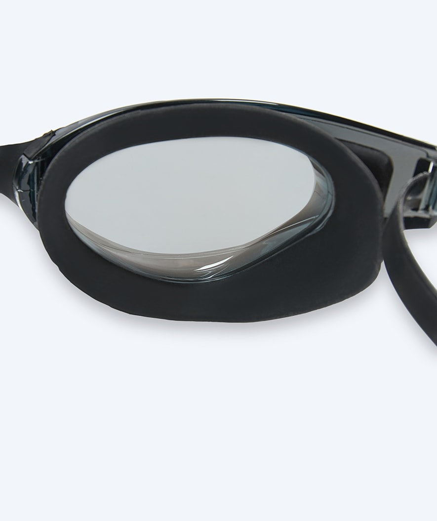 The Instinct Mirror is made with curved High-definition lenses, which provide the widest possible 180-degree view to both sides, so you always have full orientation underwater. Moreover, the high-definition lenses mean that despite the wide view, you still have a completely sharp vision all the way to the sides, where with ordinary goggles you would find that sharpness is only in the centre of the lens - that is, when you look straight out of the goggles