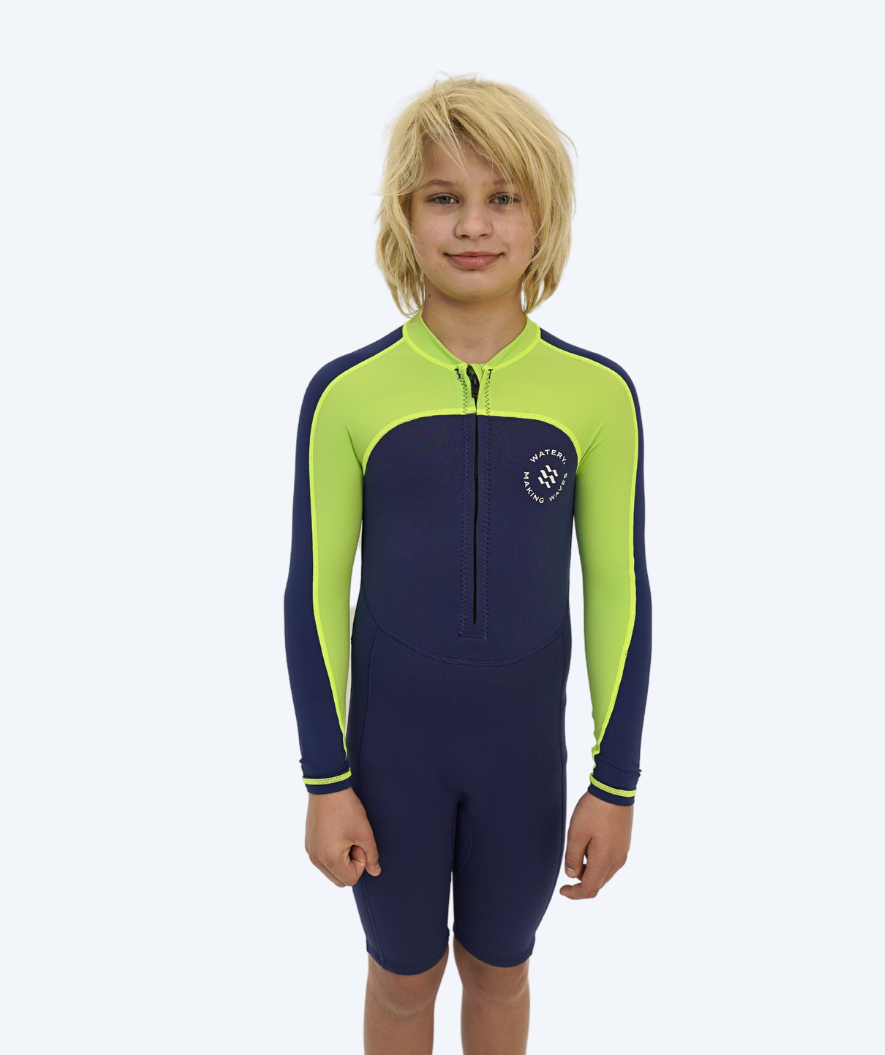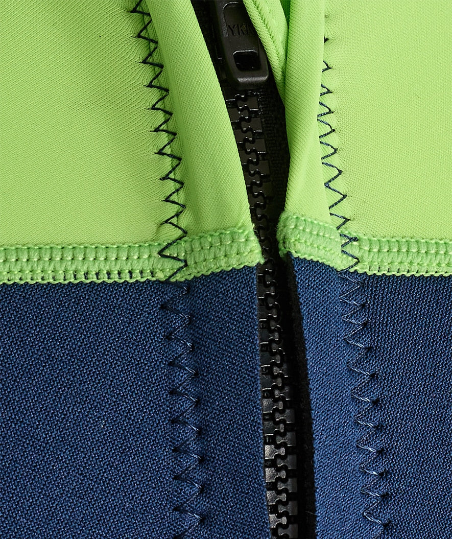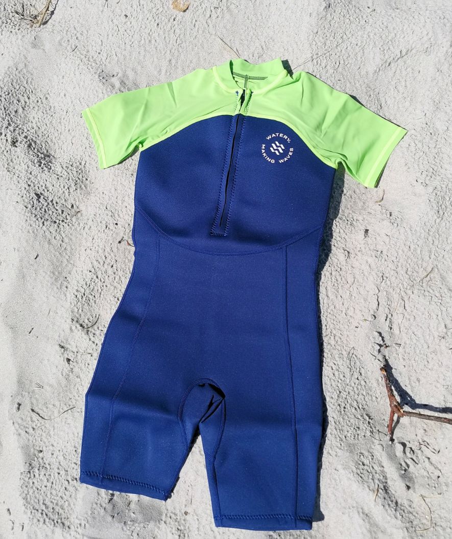 - The wetsuit is constructed in 2 mm neoprene on the legs and body, so that your kid is kept warm and is 100% protected from the sun's rays. At the same time, it provides great buoyancy for the kid. The darker colours also deliberately chosen here, provide additional warmth