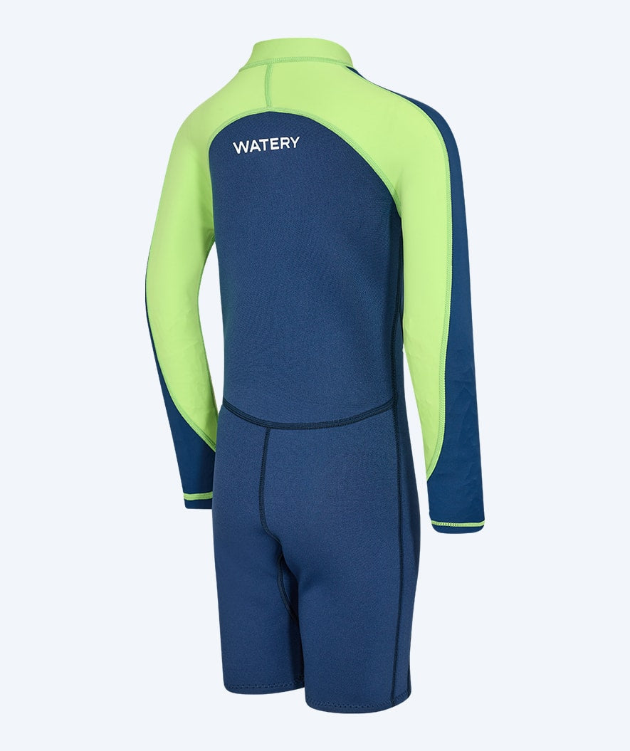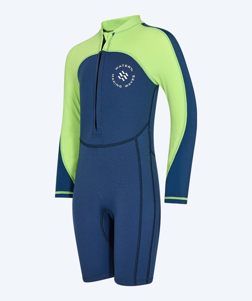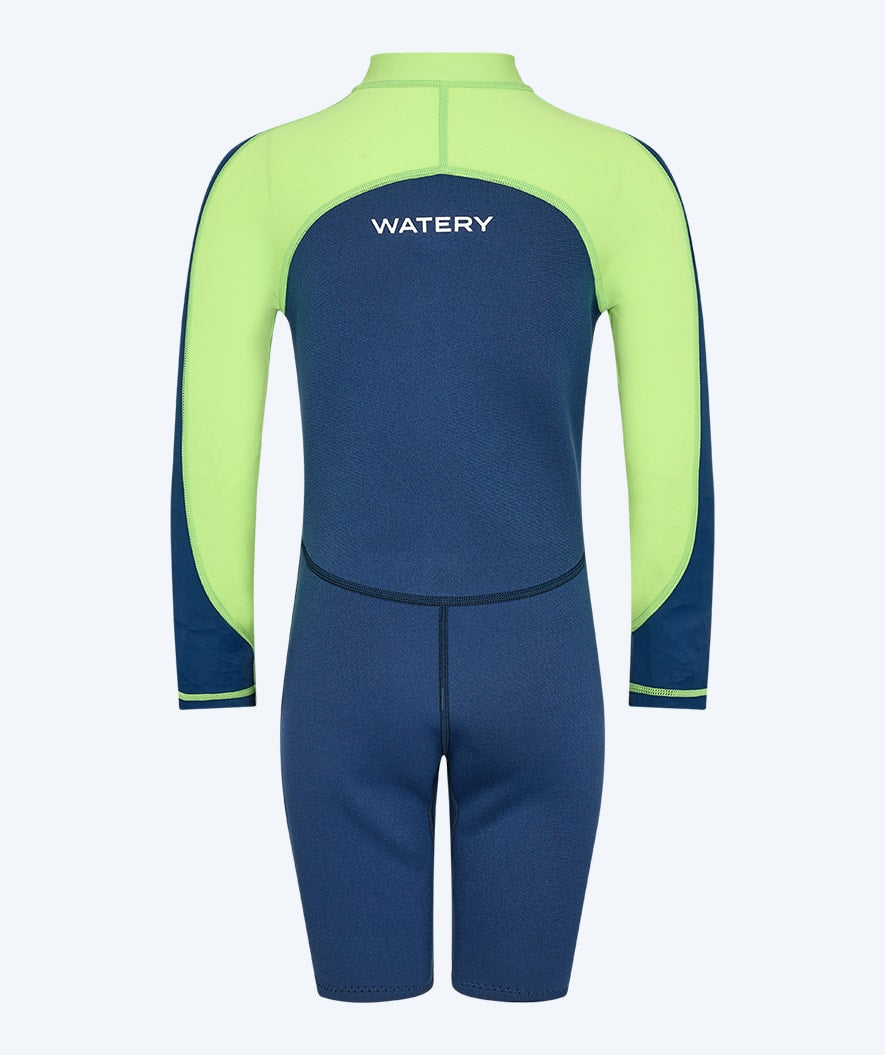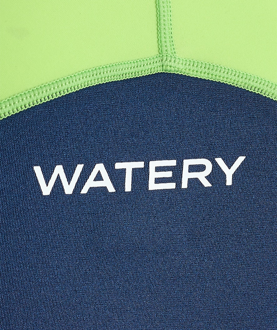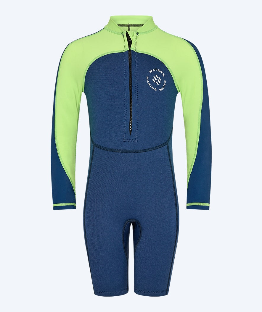Our most popular kids' wetsuit with unique UV and warming properties is this Calypso Long Sleeve Wetsuit for kids, aged 1 year to 15 years. Watery Calypso is a long-sleeved wetsuit with short legs and high flexibility at the shoulders, which will keep your kid warm both in the swimming pool and the beach. At the same time, it protects the kid from the sun's UPF+50 rays
