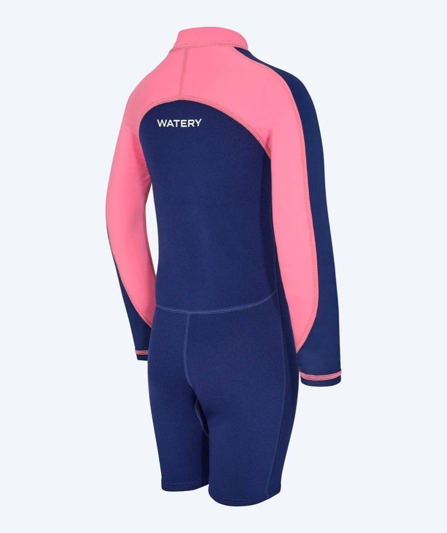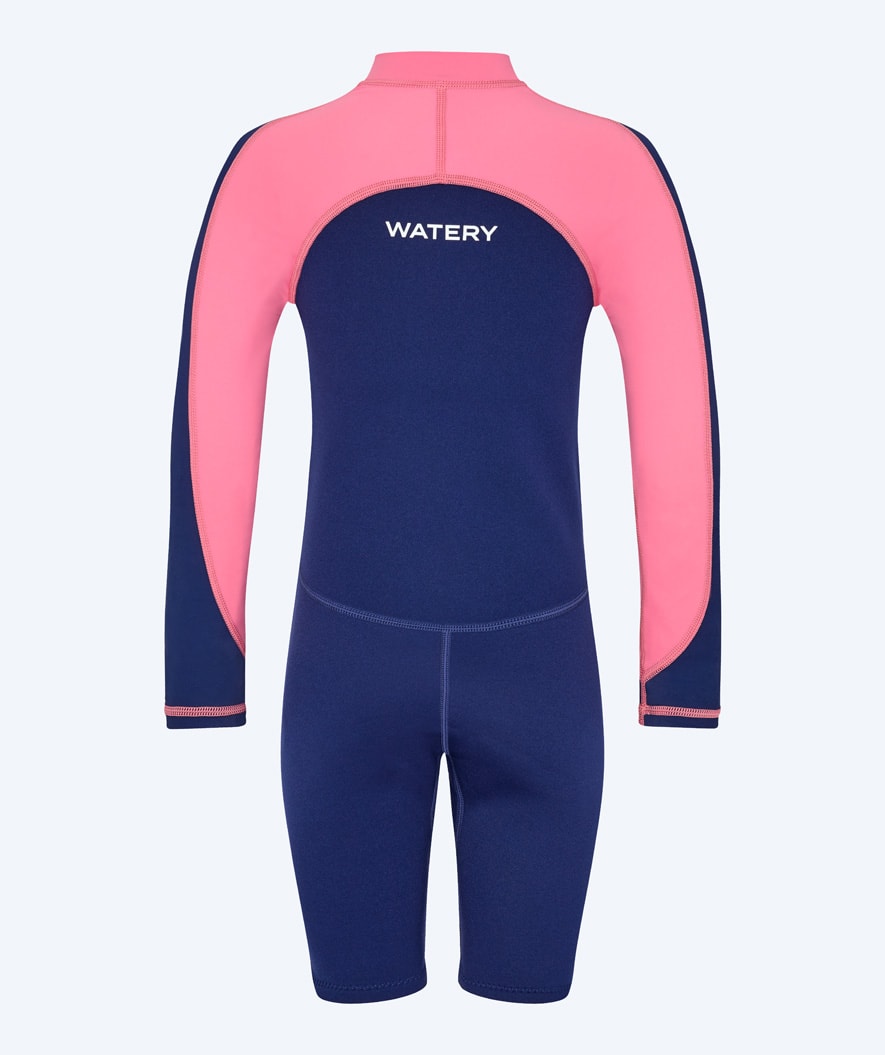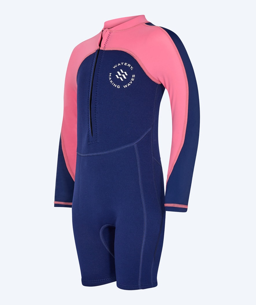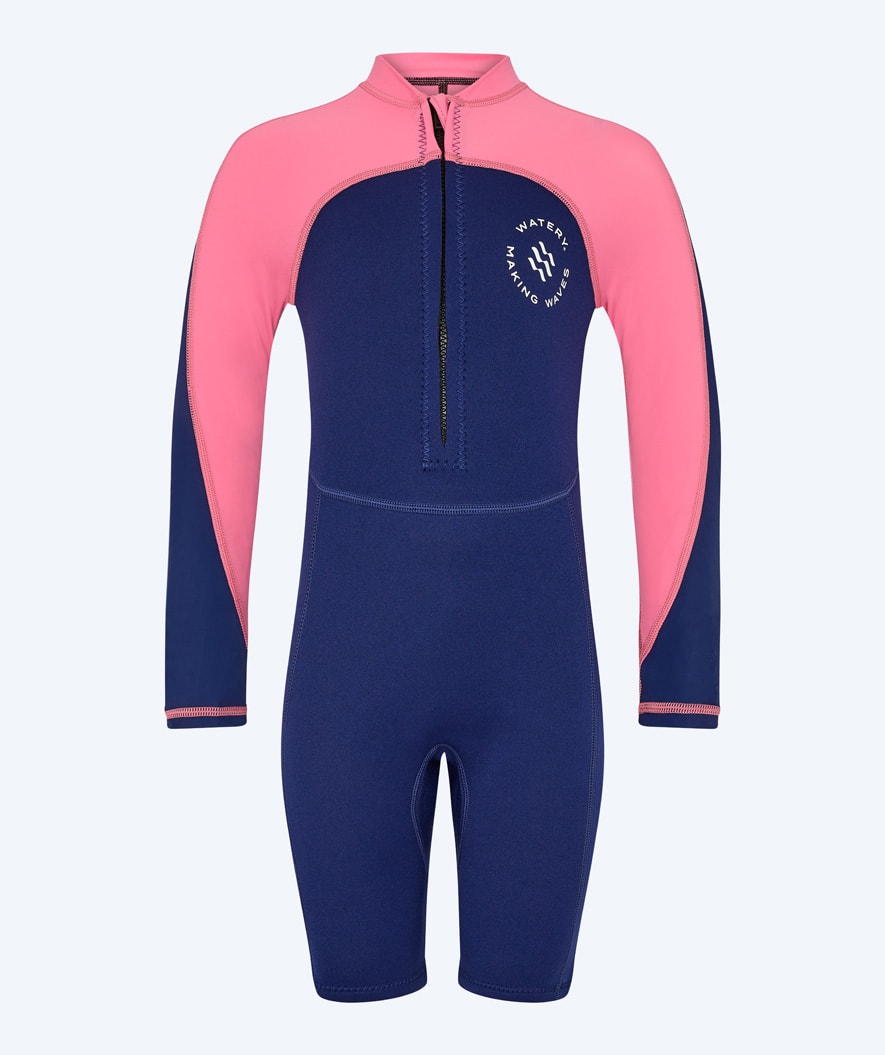 Our most popular kids' wetsuit with unique UV and warming properties is this Calypso Long Sleeve Wetsuit for kids, aged 1 year to 15 years. Watery Calypso is a long-sleeved wetsuit with short legs and high flexibility at the shoulders, which will keep your kid warm both in the swimming pool and the beach. At the same time, it protects the kid from the sun's UPF+50 rays.