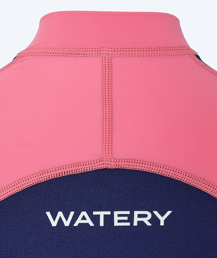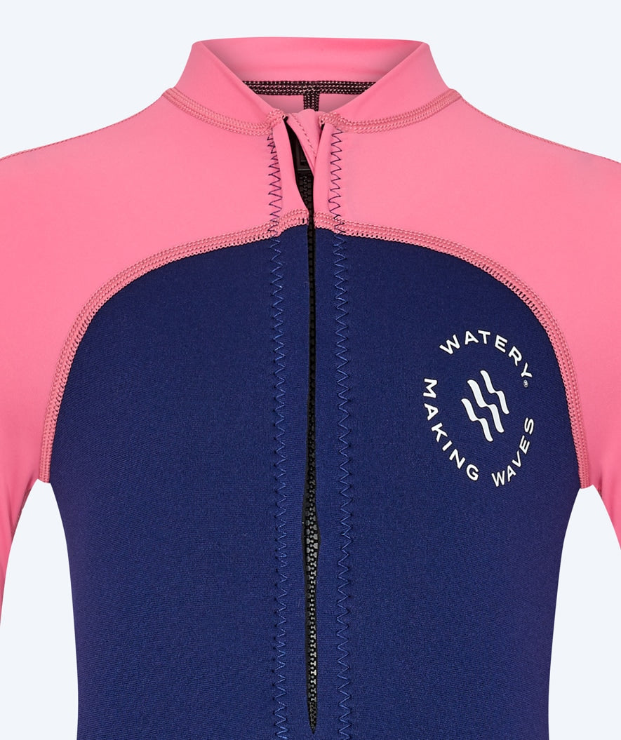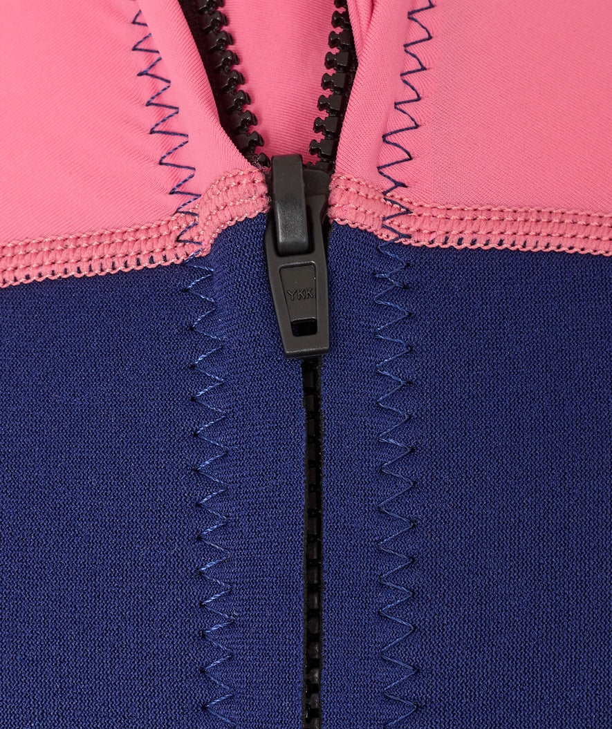 In addition to the stylish Nordic design, the combination of the two materials, neoprene and Polyamide Lycra, is what positively sets Calypso apart from the rest. Where the pink sleeves and the top are made of the light and flexible Lycra, which makes even the most lively kids feel completely free. The legs and body in the blue colour are constructed in 2 mm neoprene. This both provides a high degree of buoyancy and keeps the body warm.
