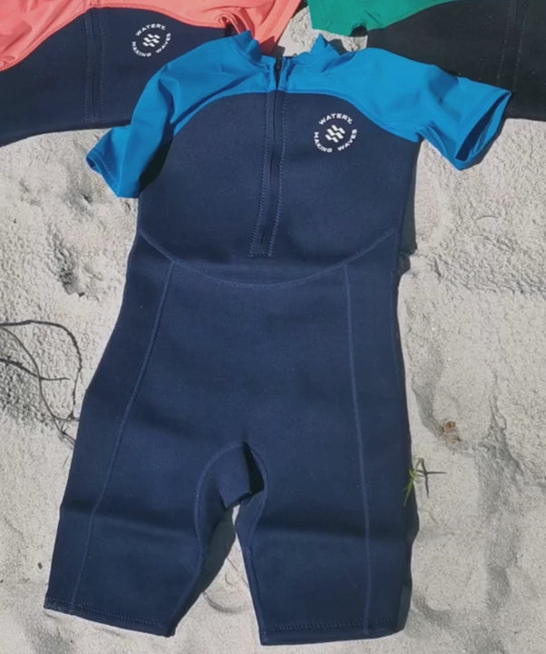 - The wetsuit is constructed in 2 mm neoprene on the legs and body, so that your kid is kept warm and is 100% protected from the sun's rays. At the same time, it provides great buoyancy for the kid. The darker colours also deliberately chosen here, provide additional warmth