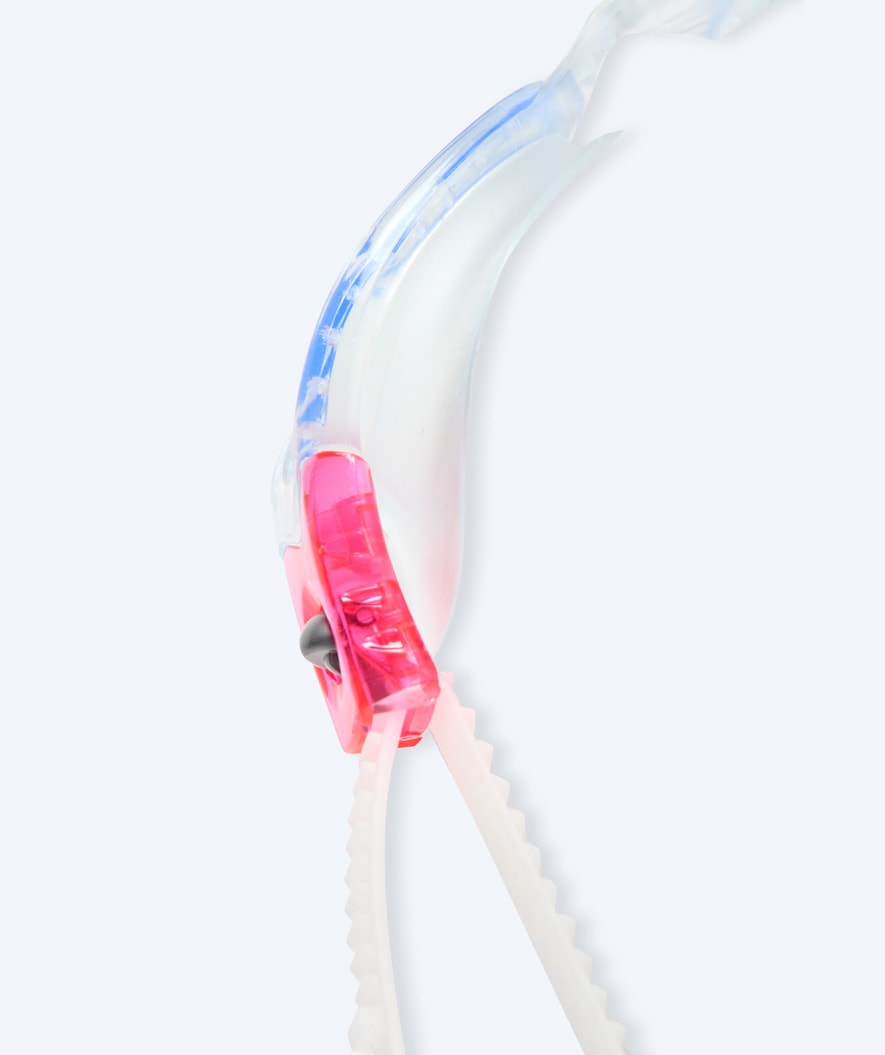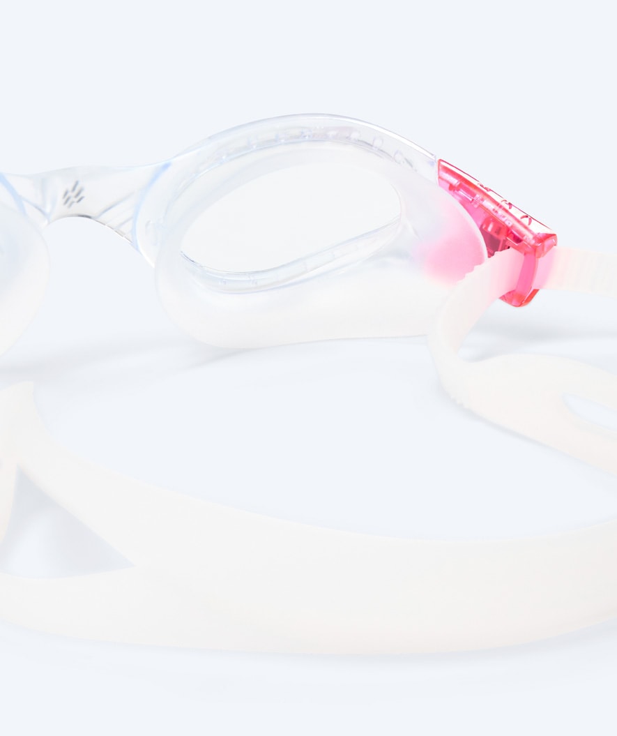 The narrow and smaller model of our most popular sports swim goggles, Mantis, is this Pacific Active. Contrary to Mantis, which is a larger swim mask, this is a smaller swim goggle that takes up less space on the face and seems less overwhelming. However, on the other hand, it is not as stable and firm. But still with a wide 180 degree field of view, a safe and comfortable fit that does not allow water to enter the goggles and an anti-fog treated lenses, the Pacific Active is also already a favourite. Here in our pink colour with clear lenses.