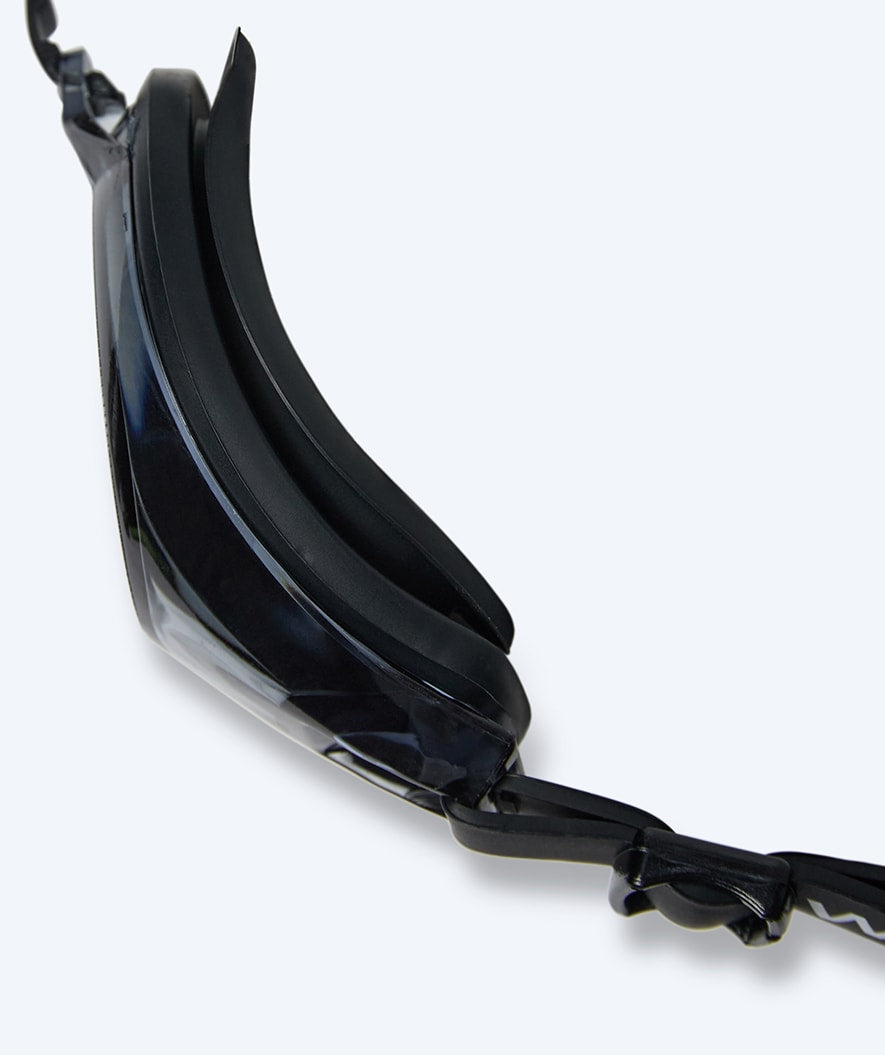 The eye cups on Ridley, which sit against your eyes, are made of specially soft and flexible premium silicone that has a unique suction capability around the eye. This also means that you can do the typical goggle test: put the goggles on your eyes without straps, and they will still stay in place. For you, this means goggles that don't require the straps to be very tight, thus avoiding red marks and allowing you to swim for hours without noticing them