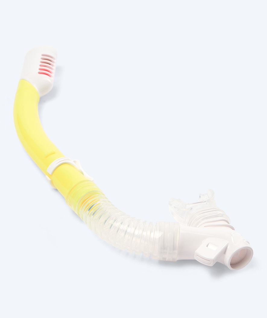 The colours in which the Watery Triton snorkel for kids is available don't get much more Nordic and stylish. Here in the bright yellow colour, but also available in blackred/pink, blue, white, and red.