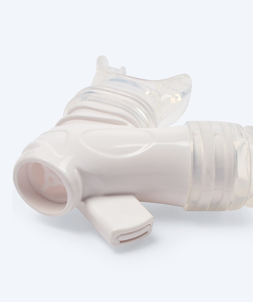 • The silicone mouthpiece is made of high-quality silicone with a comfortable bite, specifically designed for kids between 6 and 14 years old. It can also be completely removed and either replaced or simply cleaned and then reattached. Together, this ensures that the same snorkel can be used for several years - without having to be replaced. The mouthpiece is of course food approved