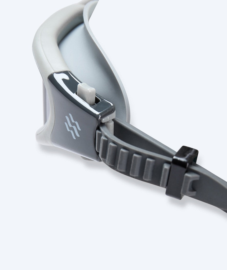 This Raven Active in grey has smoke lenses. It can be used both in the swimming pool and on the beach. In addition to this, the Raven model is also available with Mirror glass in several colours - Black/yellow, Black/blue, Black/white, Black/red, Black/silver, Black/gold, Grey/silver, Black/blue, Light blue/gold, Pink /silver, Pink/gold, Purple/silver, Dark blue/silver, Dark blue/gold. It is exactly the same glasses and functions, the only difference is the Mirror lens, which means that people from outside cannot see into your eyes.