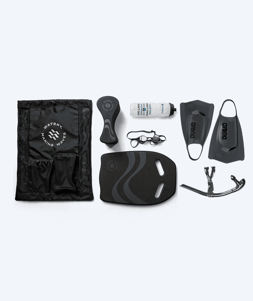 Space for all imaginable swimming equipment, including swim fins, snorkel, finger paddles, swim board, pull buoy, etc