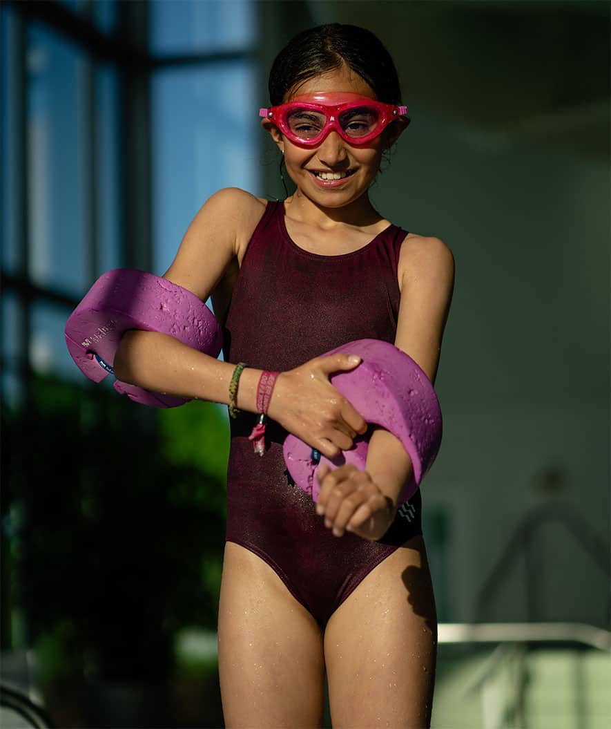 Compared to our other popular model, the Freestyler Solid for girls, this Eco Pool Party model offers more support and coverage in the suit design, with wider straps, a lower leg cut for more coverage at the hips, a firmer back for higher body firmness, a higher chest curvature, and is made from recyclable materials. Conversely, this model is not as sporty in appearance and offers a lesser degree of freedom.