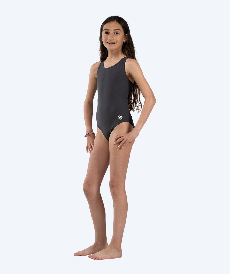 The Eco Pool Party for girls in bone grey is constructed with a single layer of fabric, a more closed back for optimal support, a medium leg cut for more hip coverage, a higher curvature at the chest, a clean colour, and a discreet white Watery logo at the bottom near the hip. Overall, this provides a swimsuit that allows for all possibilities to let loose in the water without worrying about how the suit fits afterward - it just does.