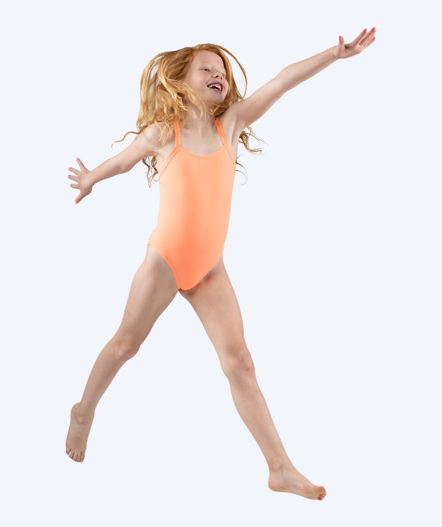 This Freestyler Solid swimsuit for girls has quickly become our clear top seller and a favourite among water-loving girls between 4 and 15 years. Designed with a high leg cut, thin straps, free back and made in our particularly durable and chlorine-resistant Aquaflex material, this is optimal if your daughter spends particularly many hours swimming in the track and/or playing in the swimming pool and at the beach. Here in the colour coral