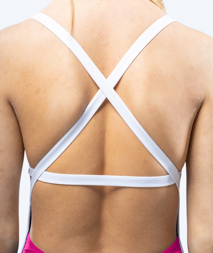 Stylish, recyclable, and made for any beach trip and/or swim, Watery Eco Sunkissed Solid is crafted with our specially developed WavePlay material. Composed of 78% recycled nylon from plastic bottles and 22% elastane, the swimsuit offers 4-way stretch, 100% UV protection, the softest feel against the skin, and maintains its shape through +500 hours in water. The model's unique design features non-adjustable cross-back straps, double-lined fabric, a high leg cut, wider straps, and cheeky coverage at the back, giving you a sporty and feminine look in Eco Sunkissed