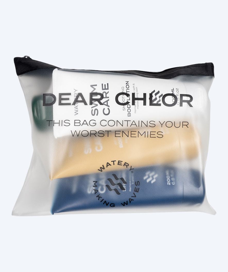 Get a nice transport bag for your swim care set to and from the swimming pool or during a trip abroad. Avoid lying scattered in the swim bag or your swim bag being filled with liquid if one of the tubes breaks. A brilliant and for many necessary additions for every swimmer - also made in durable frosted PVC, which gives the bag an exclusive look with an Oxford top with YKK zip, which ensures that the bag is 100% waterproof.